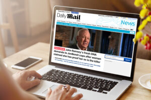 Rear view of high school girl using laptop for doing homework, browsing Internet, searching for required information, sitting at desk with mobile phone with copy space screen lying next to her